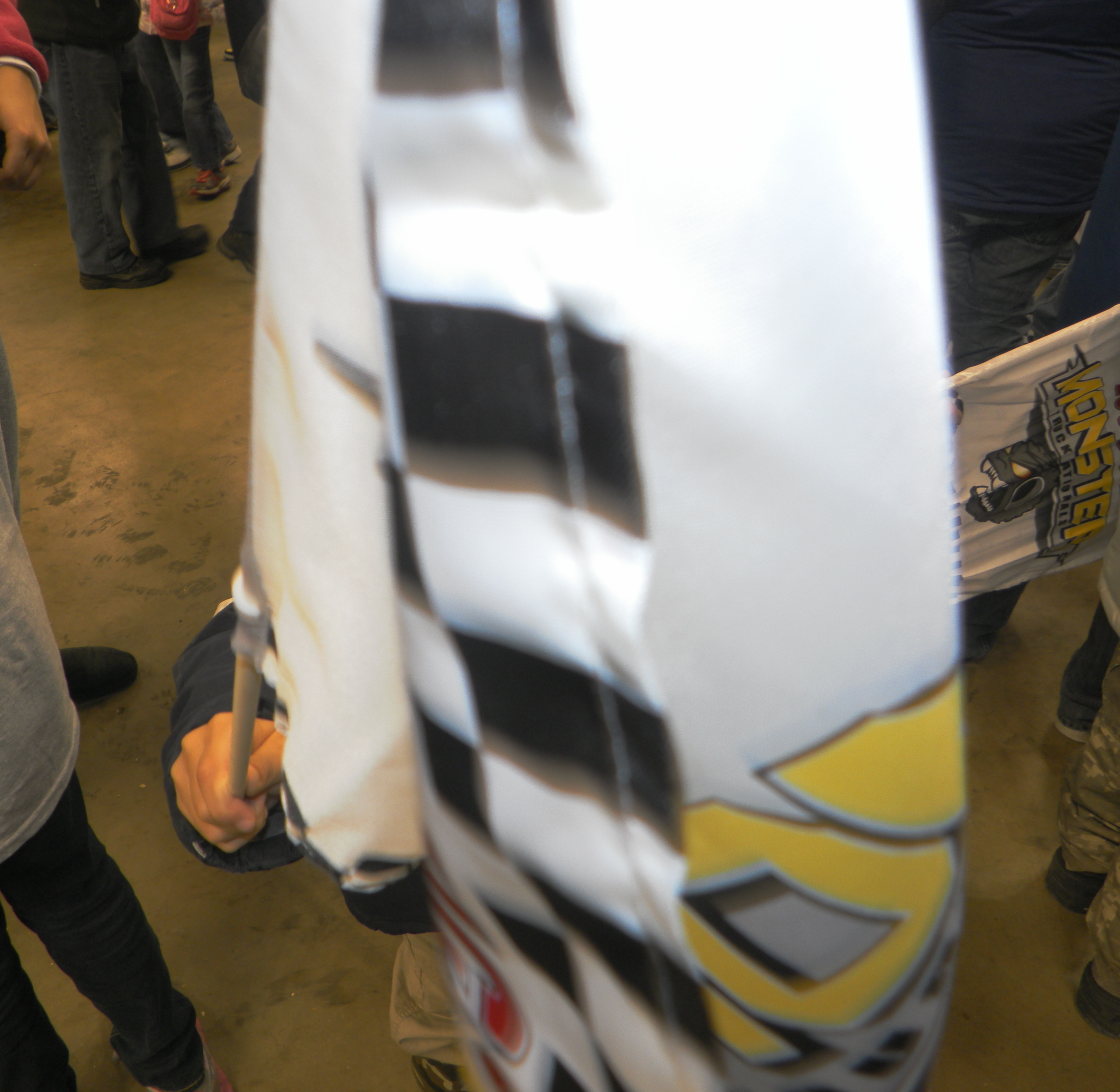 Before the show there was a pit party. Everyone got to get a close-up look at the trucks and meet the drivers. The first thing the boys noticed when we got there was that some other children had Monster Truck flags for the drivers to autograph. Well, if people we’d never heard of before, and would never see again, were signing other kids’ flags, then we needed flags for signing too.