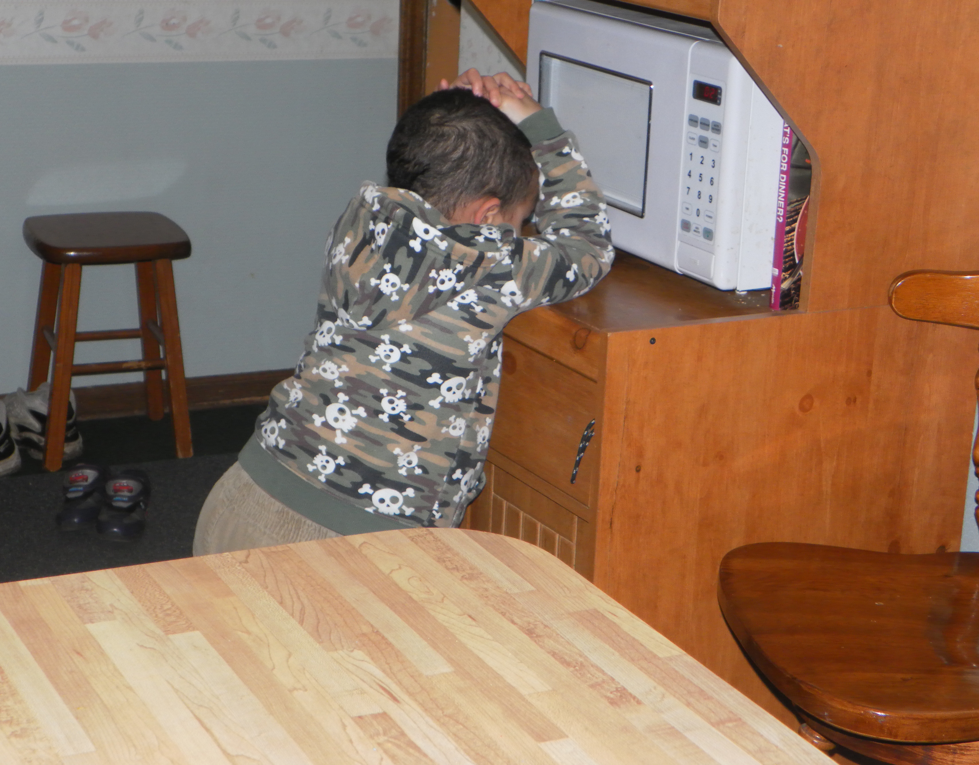 In this over-acted dramatization of the recent tragedy, the boy makes an editorial comment by turning to the microwave for the sympathy that more fortunate children expect from their parents.