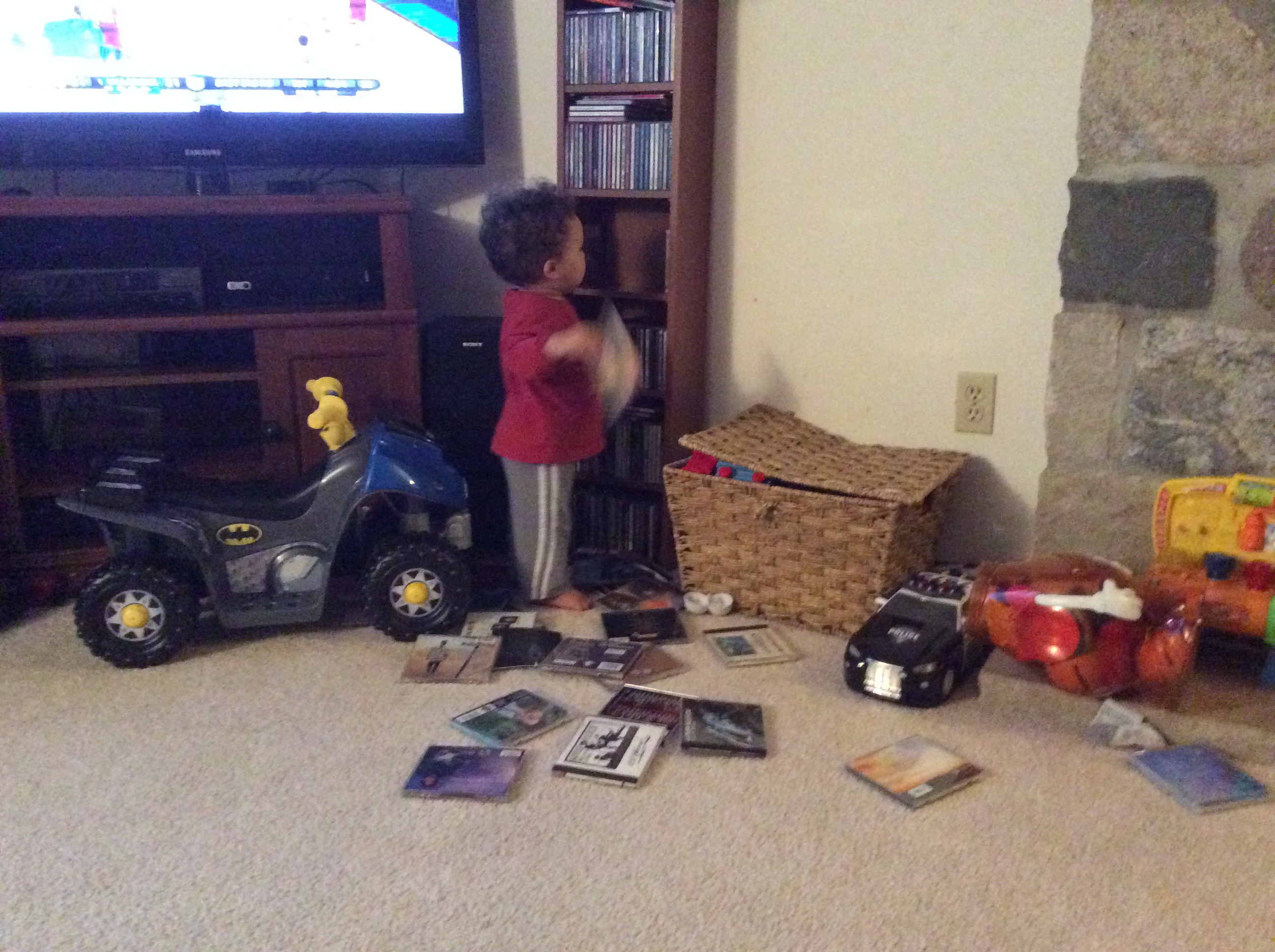 What is it with toddlers and CD’s? I manage to teach Dude not too touch any of it, only to have a friend of mine’s kid destroy several cases. Needless to day, we’re not friends anymore.
