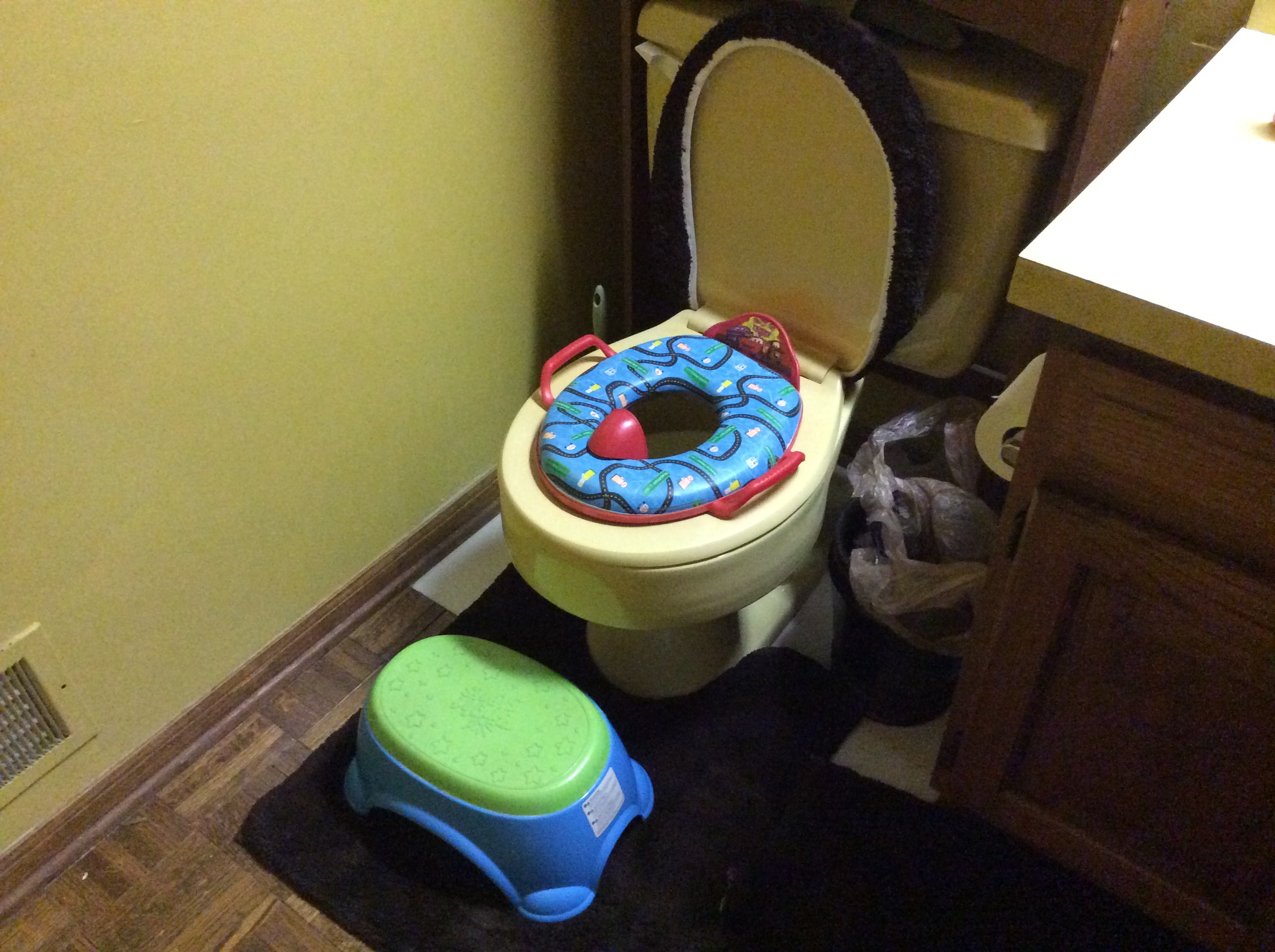 Now a veteran potty-goer, Buster has become comfortable enough with the routine to want to customize the experience to his own bizarre preferences. One day, at his request, I took him into the bathroom to have a sit-down meeting with the potty. After he pulled down his pants, I lifted him onto his child potty seat.