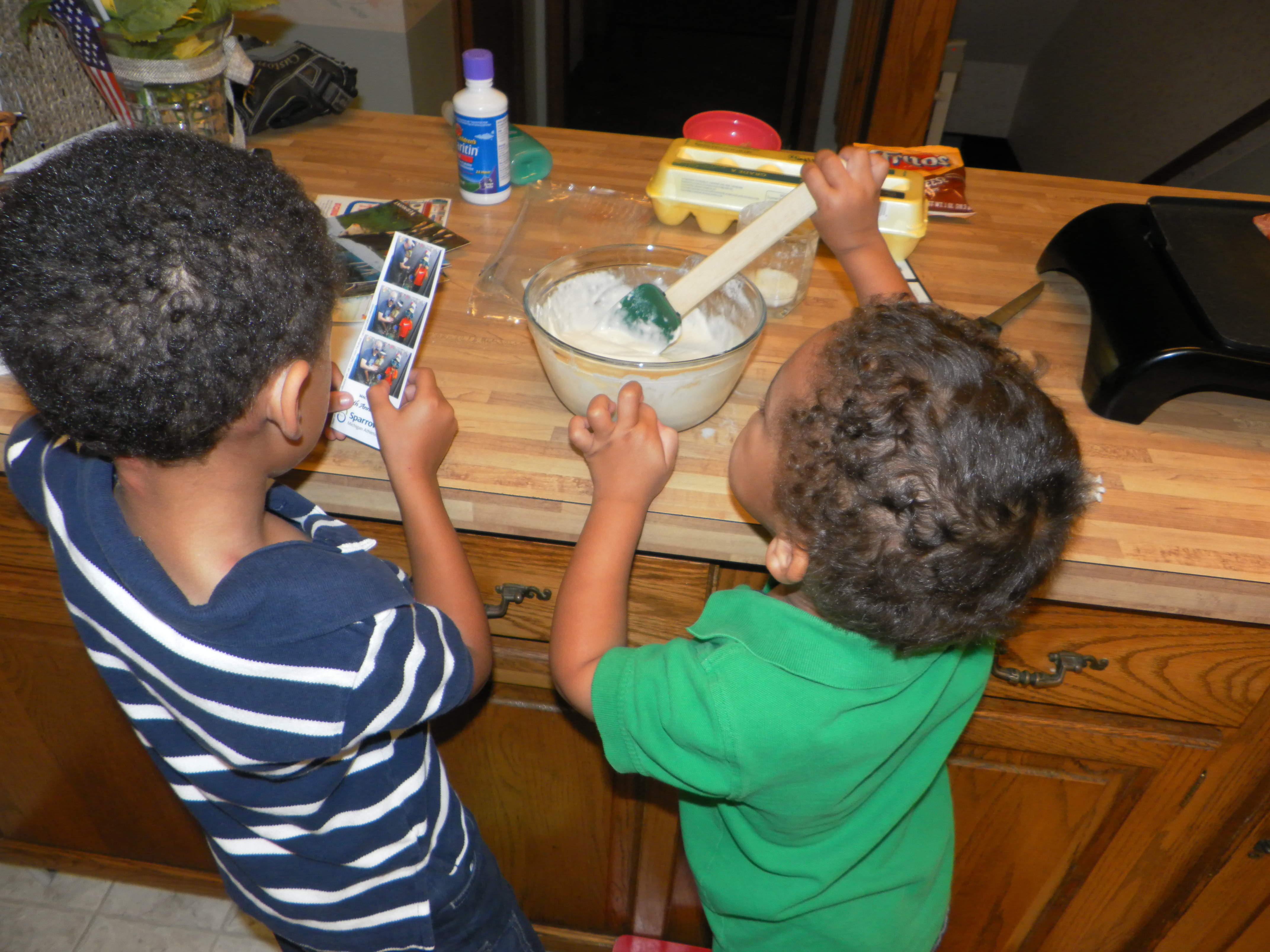 Everybody wants to pour the pancake mix, but nobody knows when to stop pouring. I make them stand down and pour the mix myself, explaining I don’t want the whole box dumped out. It turns out the box is almost empty so I end up pouring it all into the bowl. “I could have done that,” Big Brother mocks. He’s right, so I quell my impulse to hit him over the head with the empty box.