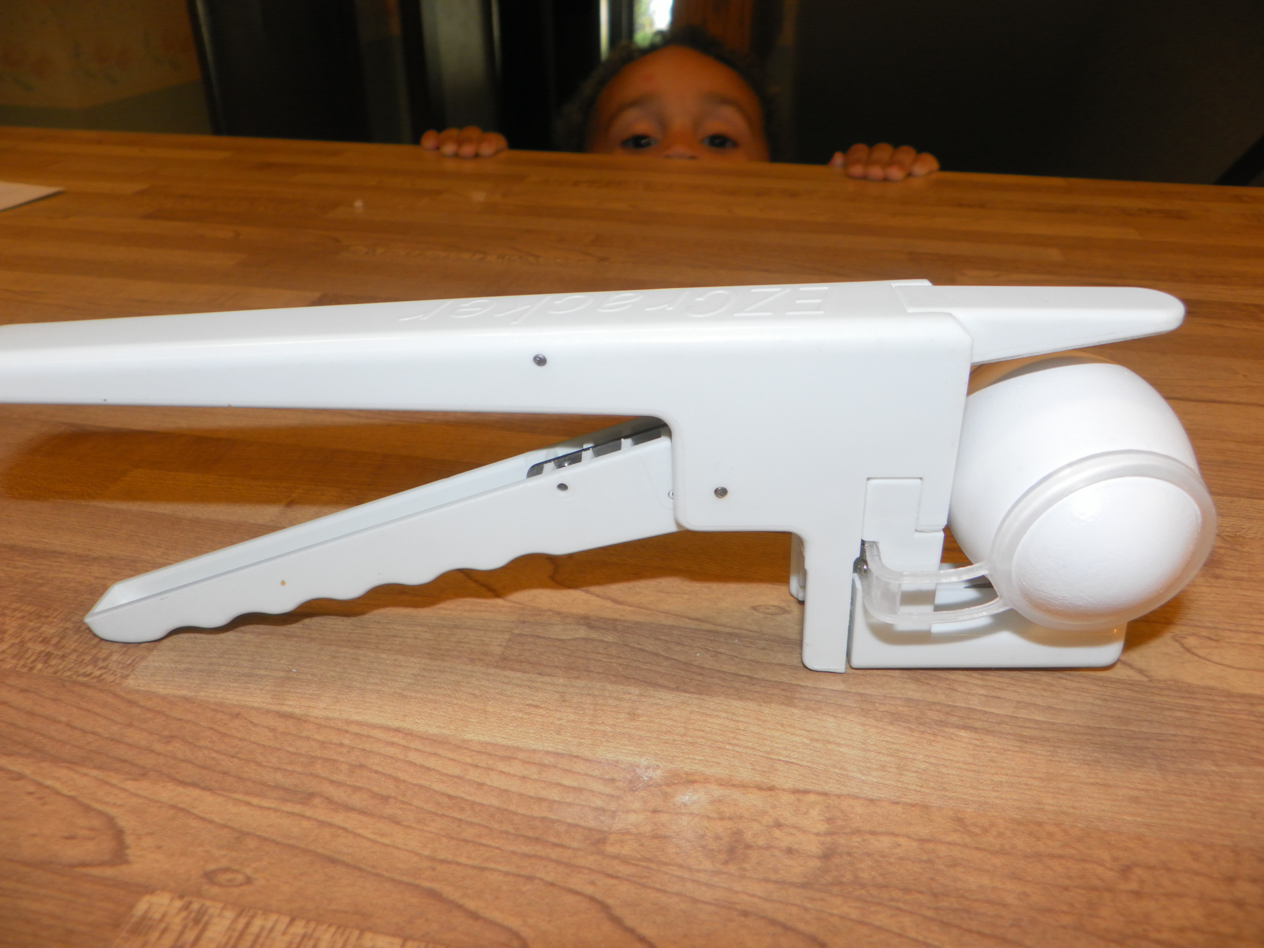 My egg cracker for the specially challenged with Big Man's best Kilroy impression in the background.