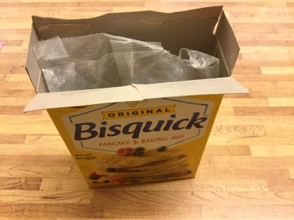 Bisquick does not deteriorate like saltines, but I find myself spilling a good portion of it, pouring it from the bag I mangled during the “attack with sharp objects” step of my baking recipe. When the bag is empty, I can get three more pancakes from the loose mix accumulated at the bottom of the box.