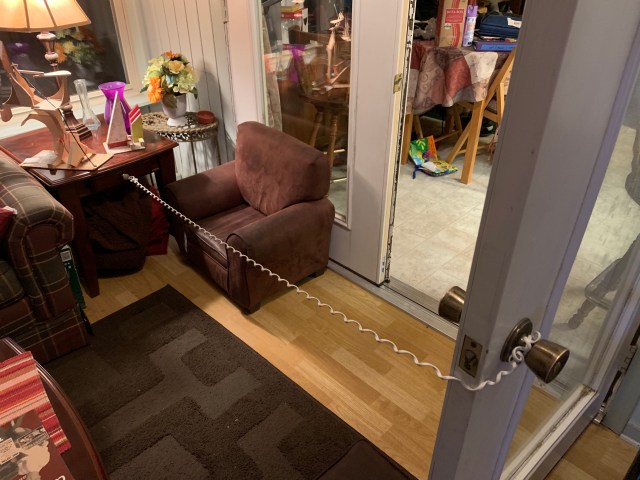 Big Man’s fascination with adhesion is not limited to broken things. Sometimes it’s part of research and development. It’s about making our daily lives easier, like when he ties bathrobe belts across the bottom of the stairs. Aesthetics plays a part too, illustrated by the many decorative things he’s affixed to our living room walls.