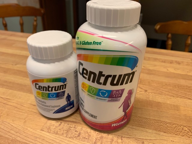 A contrast between the bottle of Women’s vitamins and the bottle of Men’s vitamins was immediately apparent. I thought perhaps her pills were larger than mine, because maybe the vitamins a man needs are smaller than the vitamins a woman needs. I don’t know how big an individual vitamin is. Or maybe she needs extra supplements to give her the strength to deal with me in isolation.