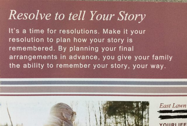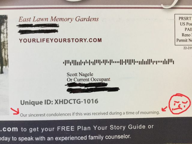 “Our sincerest condolences if this was received during a time of mourning.” In other words, “We hope we’re not too late, but if the next of kin need to throw something together right away, we are such considerate people, and by the way, we still do have plots available.”