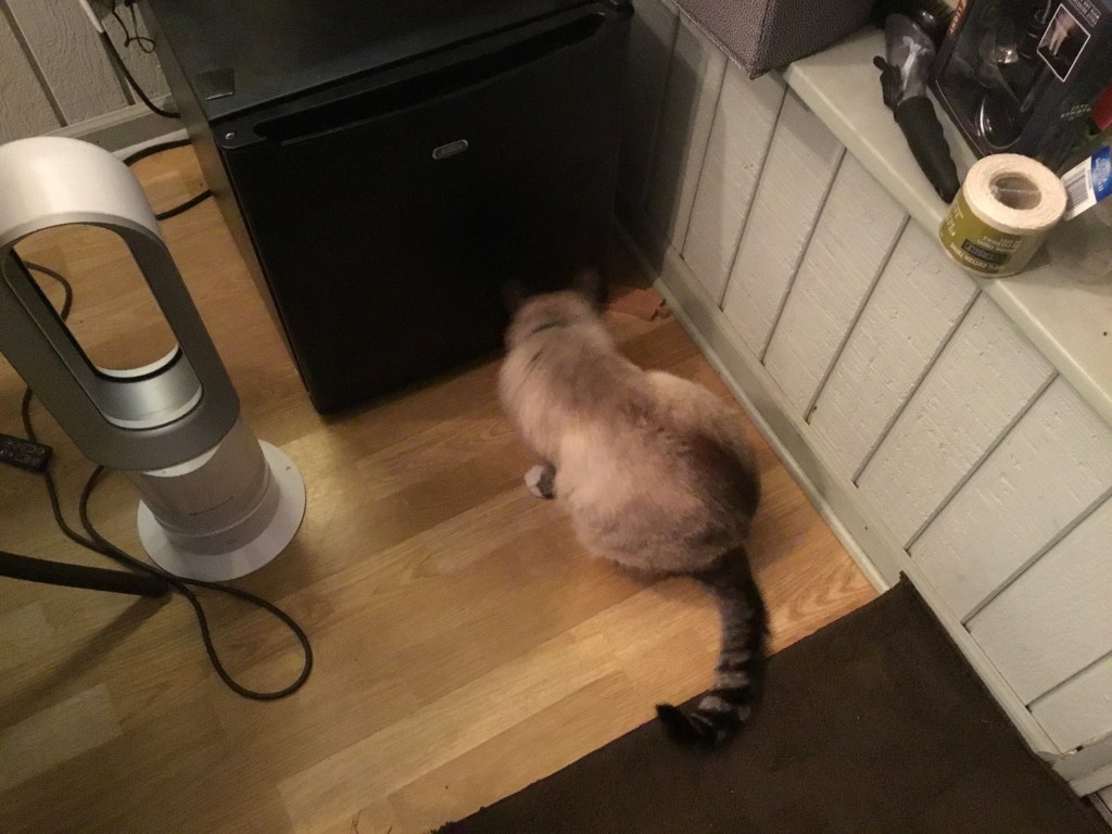 Treats in the fridge for Dad, and under the fridge for Cat.