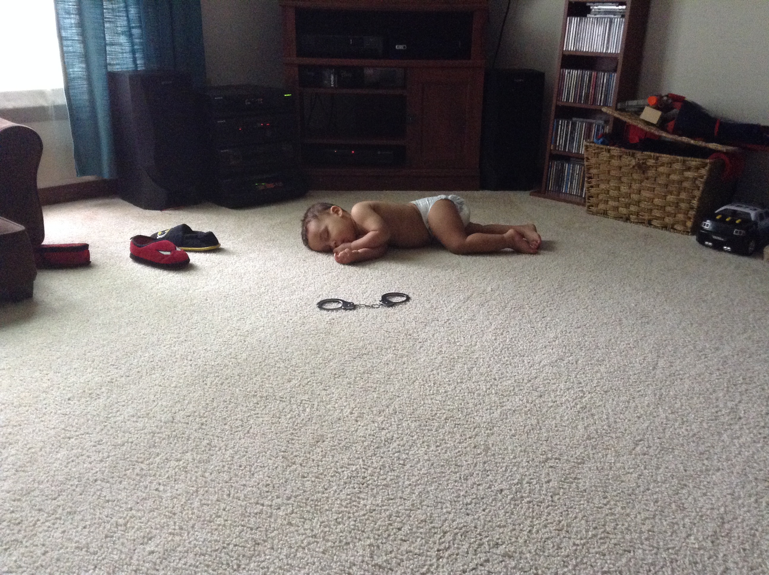 I was able to lower Buster before my arms turned to jelly, but he kept himself comforted by hugging my leg. The floor turned to hot lava when I tried to put Big Man down. He tightened his grip around my neck. I didn’t force the issue, as one crying child is plenty.