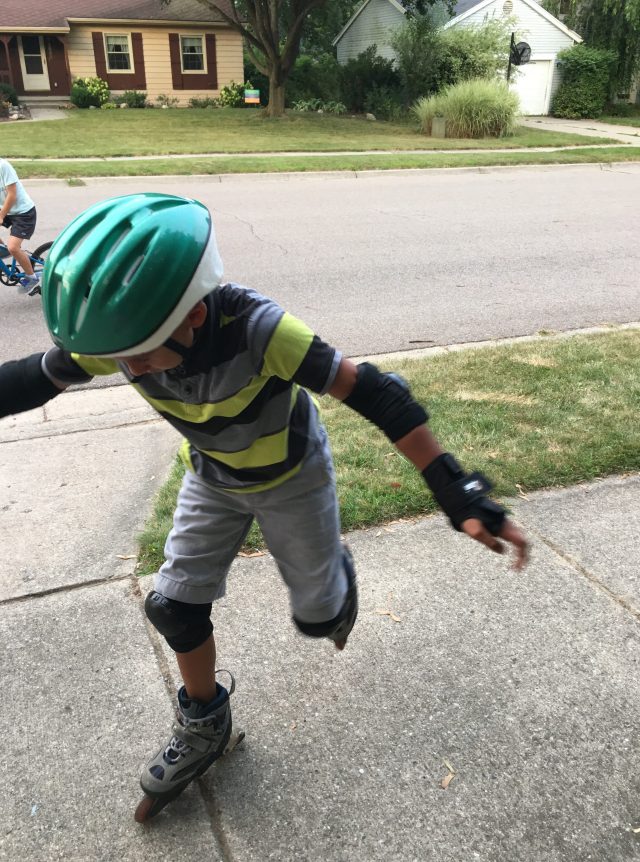 The first time he put the roller blades on his feet, he practically had to be carried out to the driveway. Up and down the sidewalk, he rolled a little, clung to me a lot, and fell down most of all. The clinging wasn’t helping him master his balance, so I cast him off. He started making two or three strides in between falls.